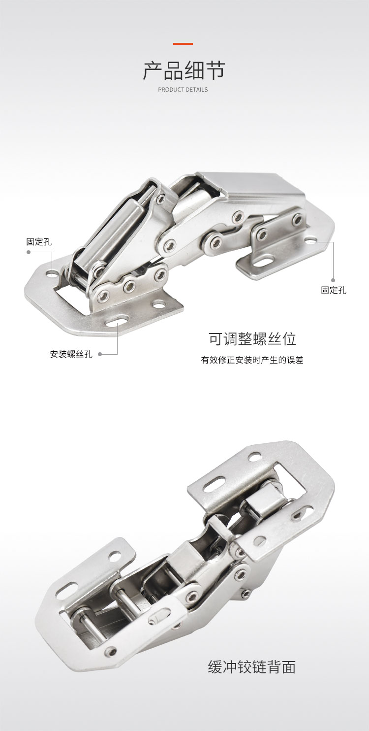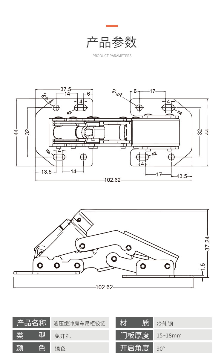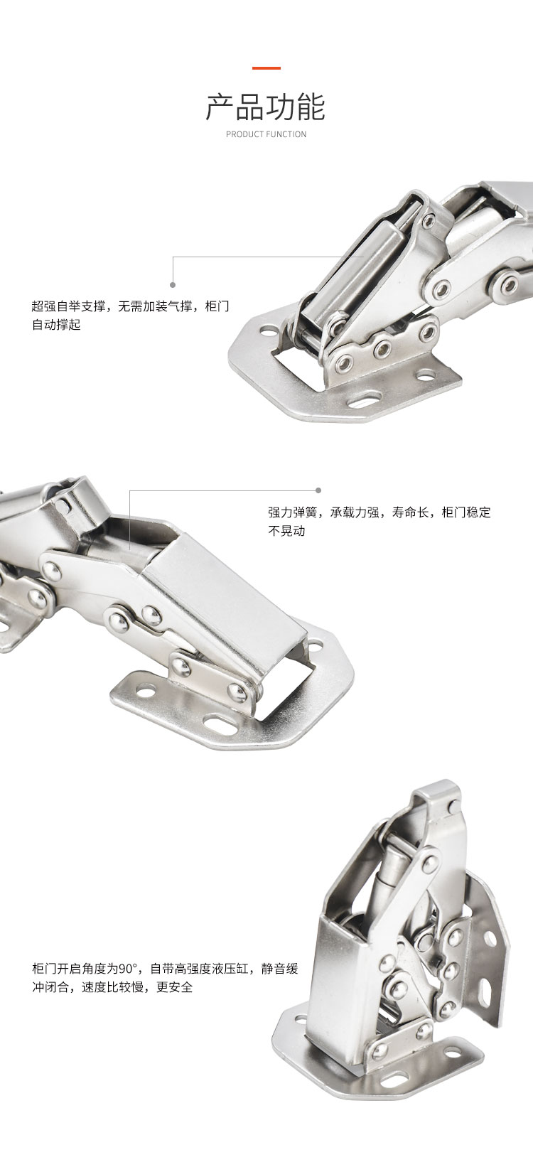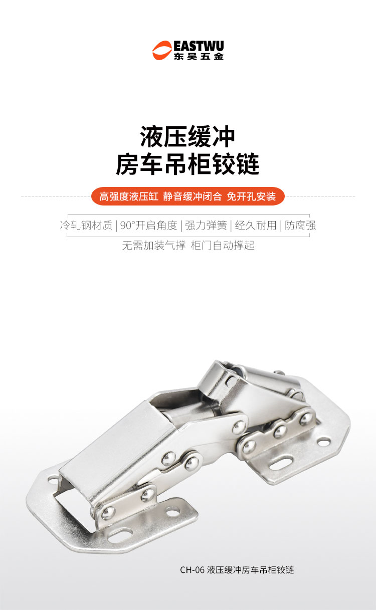 冷軋鋼房車吊柜緩沖鉸鏈 靜音緩沖 免開孔 無(wú)需加裝氣撐 柜門自動(dòng)撐起 適用門厚15-18mm 開啟角度90° 使用范圍房車吊柜、衣柜等