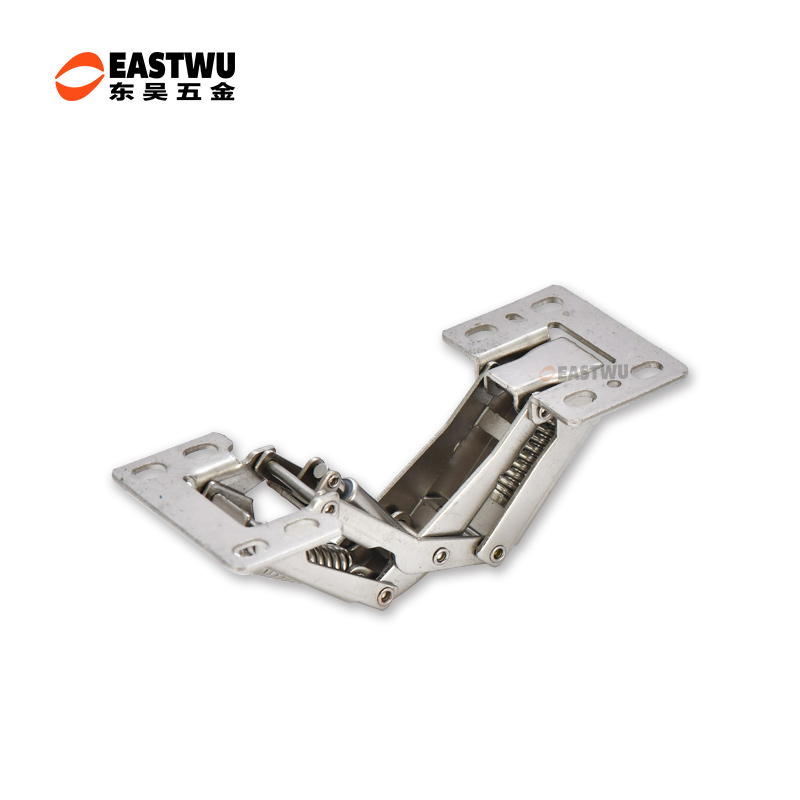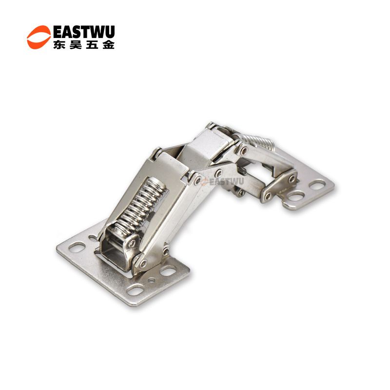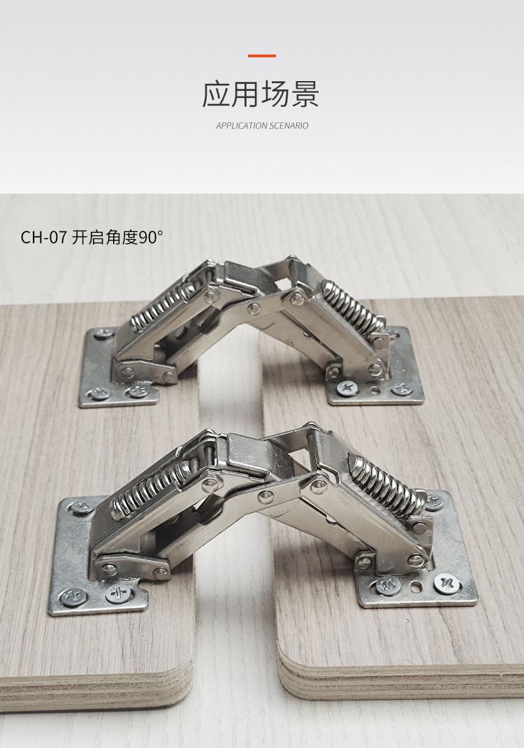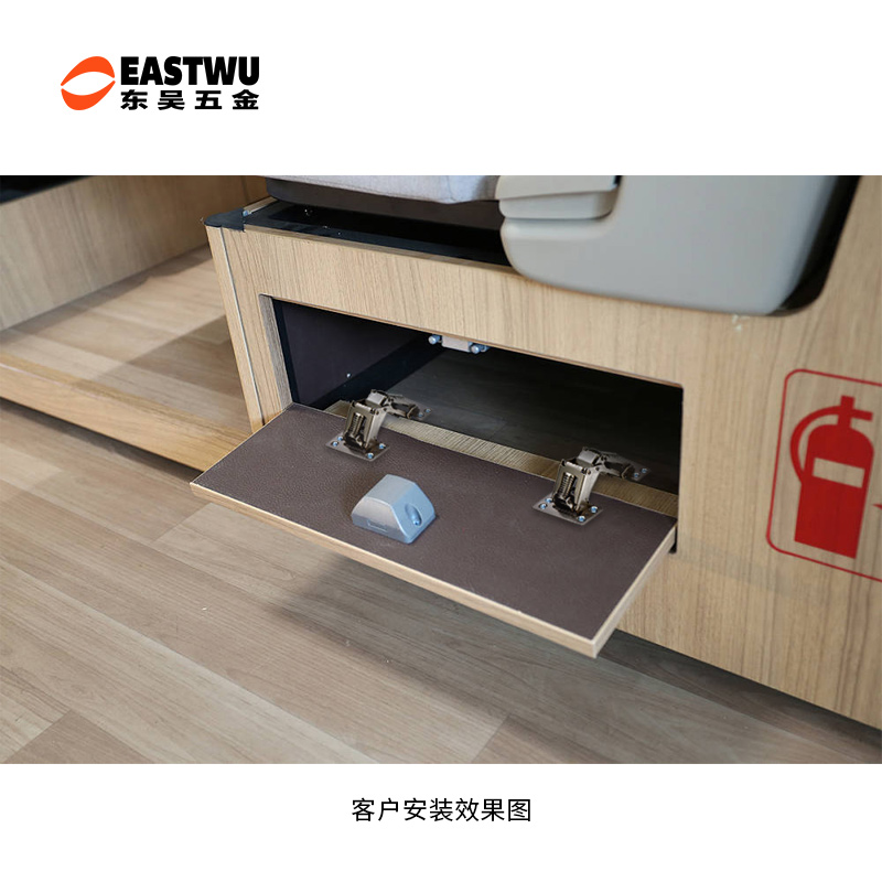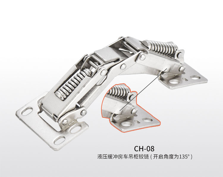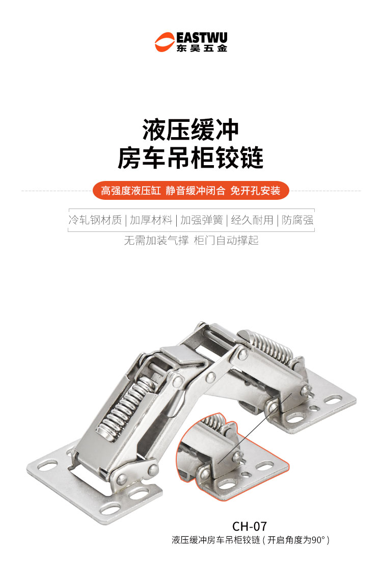 冷軋鋼房車吊柜緩沖鉸鏈 靜音緩沖 免開孔 無需加裝氣撐 柜門自動撐起 適用門厚15-18mm 開啟角度90° 使用范圍房車吊柜、衣柜等