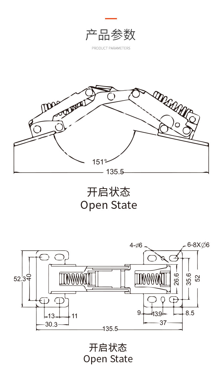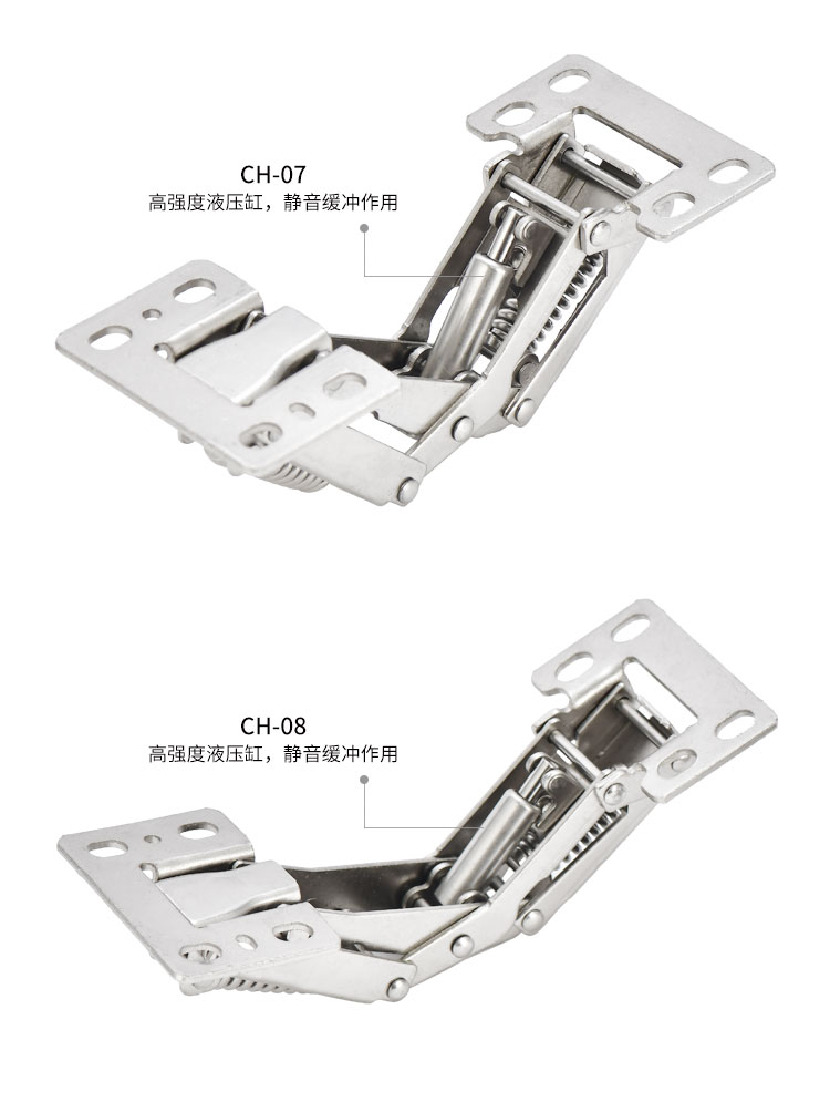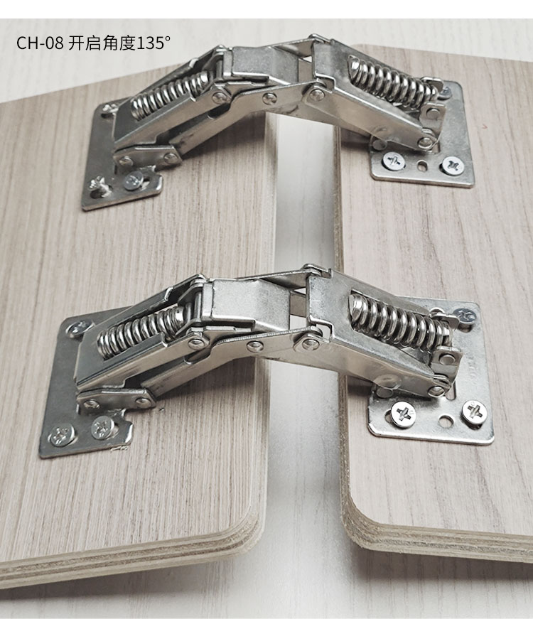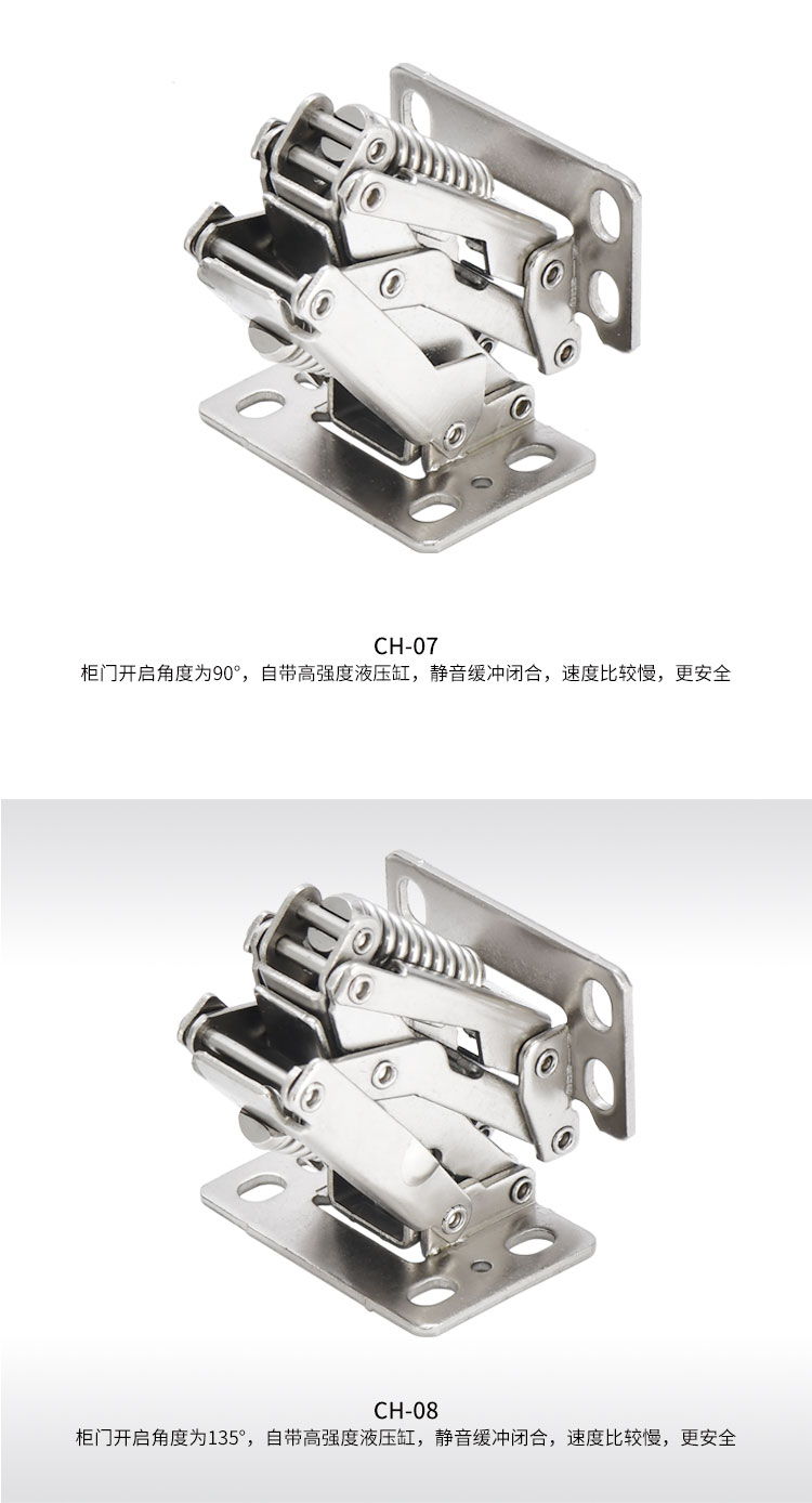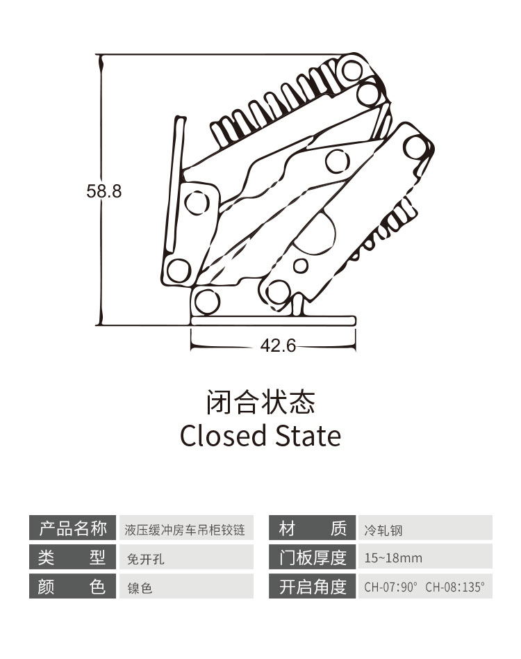 冷軋鋼房車吊柜緩沖鉸鏈 靜音緩沖 免開孔 無(wú)需加裝氣撐 柜門自動(dòng)撐起 適用門厚15-18mm 開啟角度135° 使用范圍房車吊柜、衣柜等