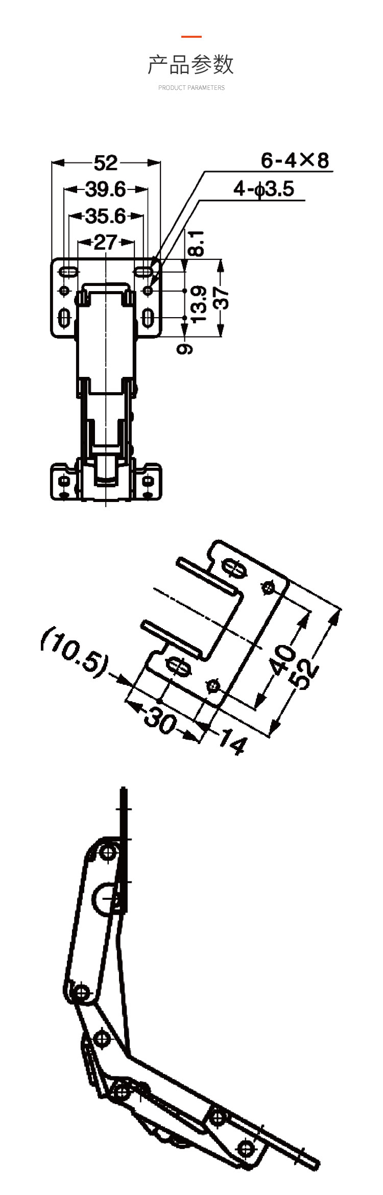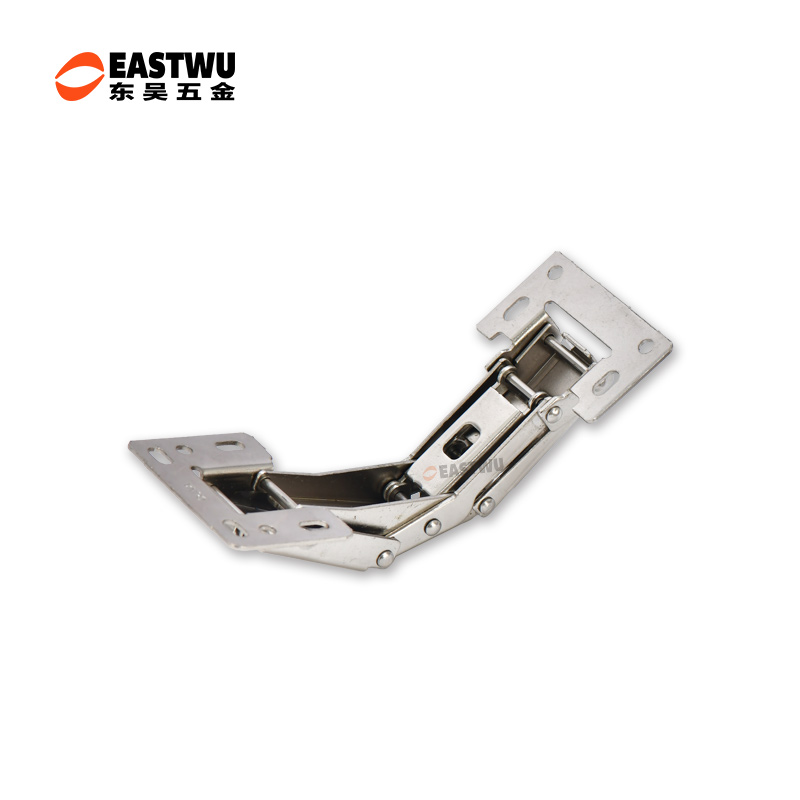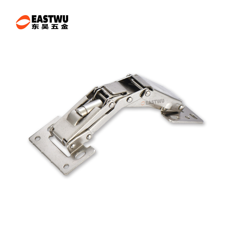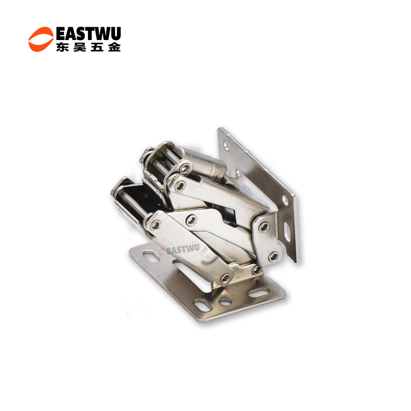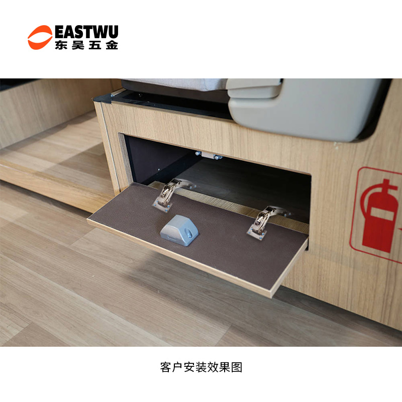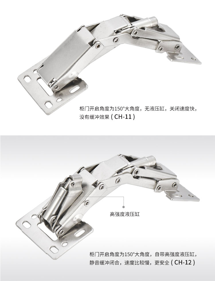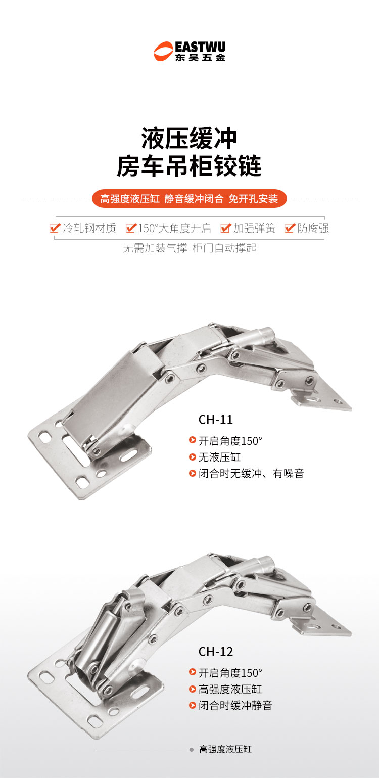 冷軋鋼房車吊柜鉸鏈 免開(kāi)孔 無(wú)需加裝氣撐 柜門自動(dòng)撐起 適用門厚15-18mm 開(kāi)啟角度150° 使用范圍房車吊柜、衣柜等