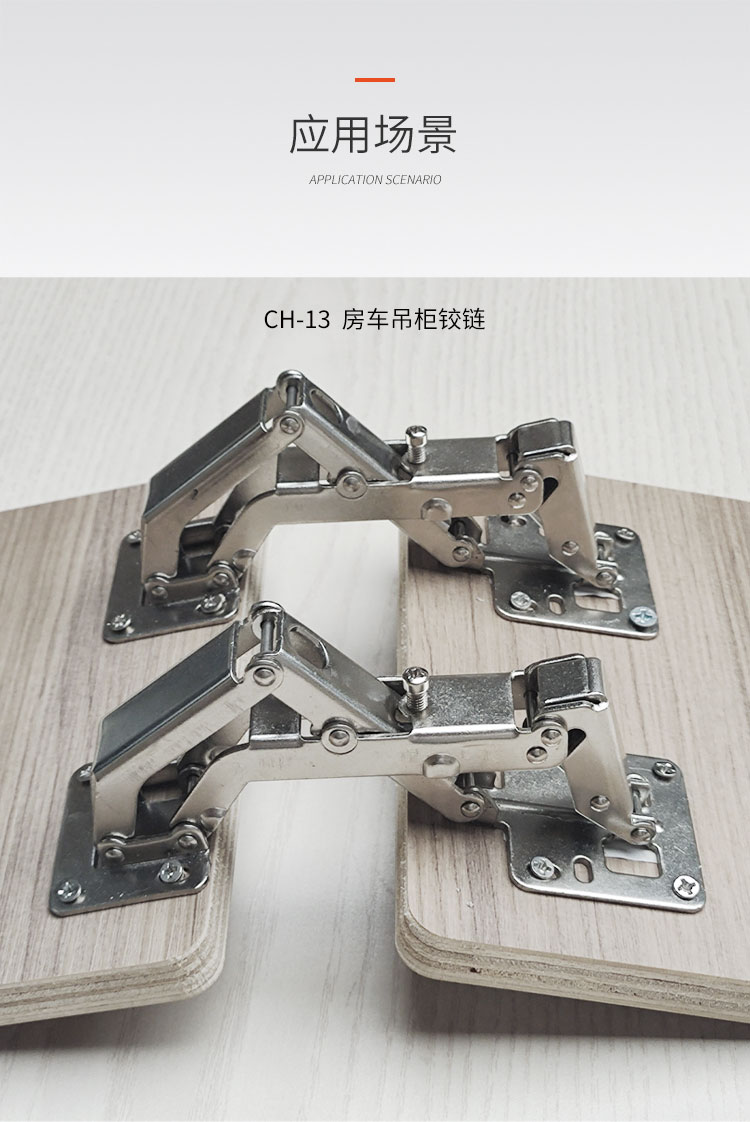 冷軋鋼房車吊柜鉸鏈 免開孔 無需加裝氣撐 柜門自動撐起 適用門厚15-40mm 開啟角度170° 使用范圍房車吊柜、衣柜等