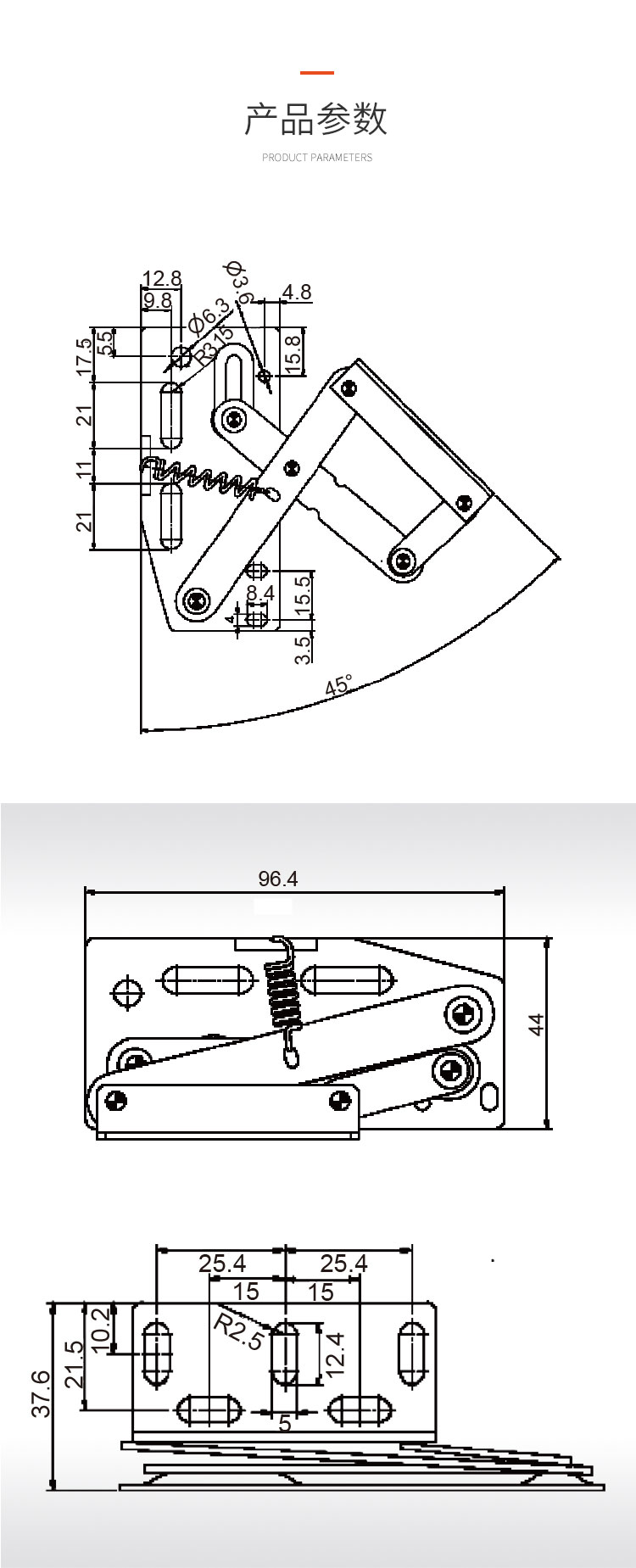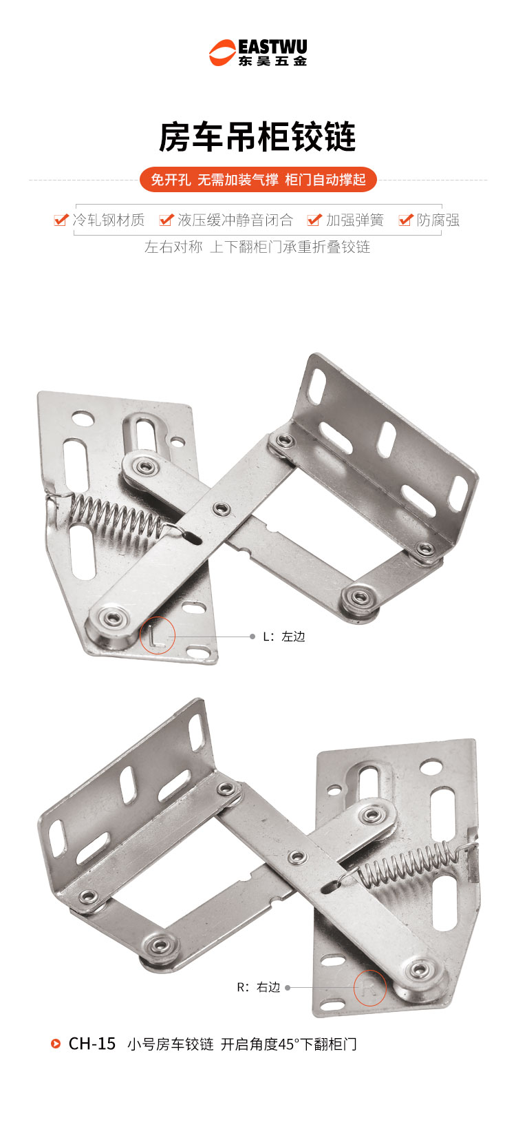 冷軋鋼房車吊柜鉸鏈,緩沖鉸鏈, 免開孔 無需加裝氣撐 柜門自動撐起 適用門厚15-18mm 開啟角度45° 使用范圍房車吊柜、衣柜等