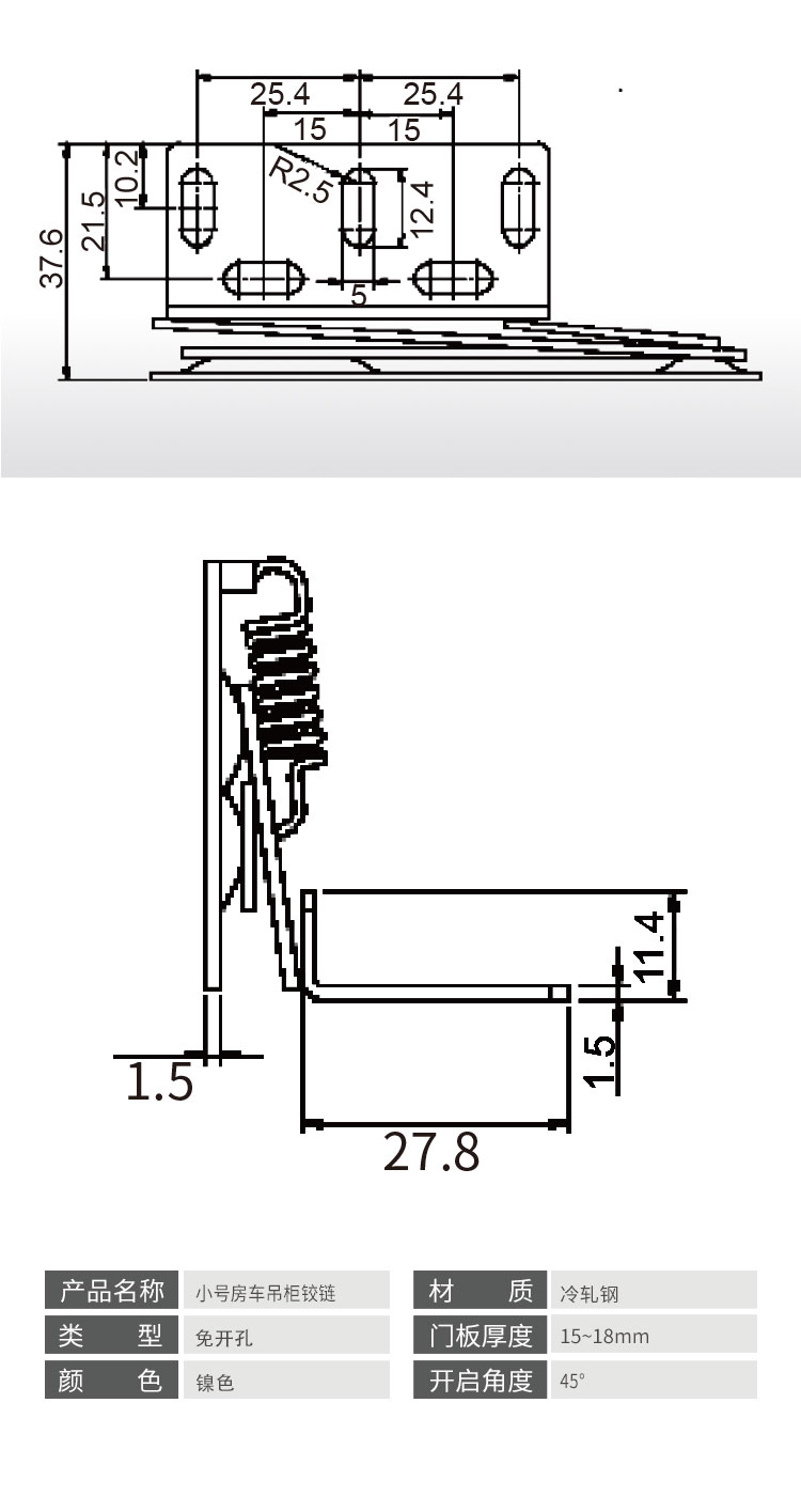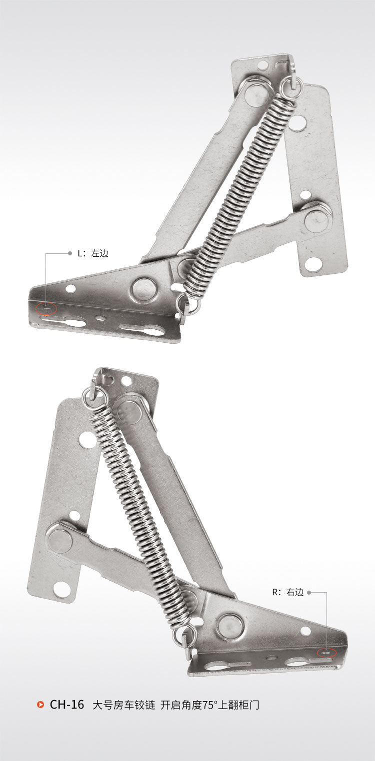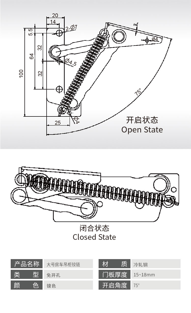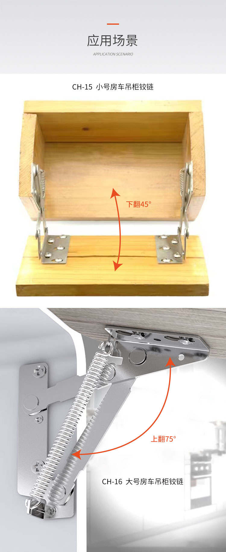 冷軋鋼房車吊柜鉸鏈 免開孔 無(wú)需加裝氣撐 柜門自動(dòng)撐起 適用門厚15-18mm 開啟角度75° 使用范圍房車吊柜、衣柜等