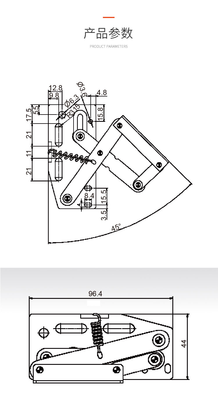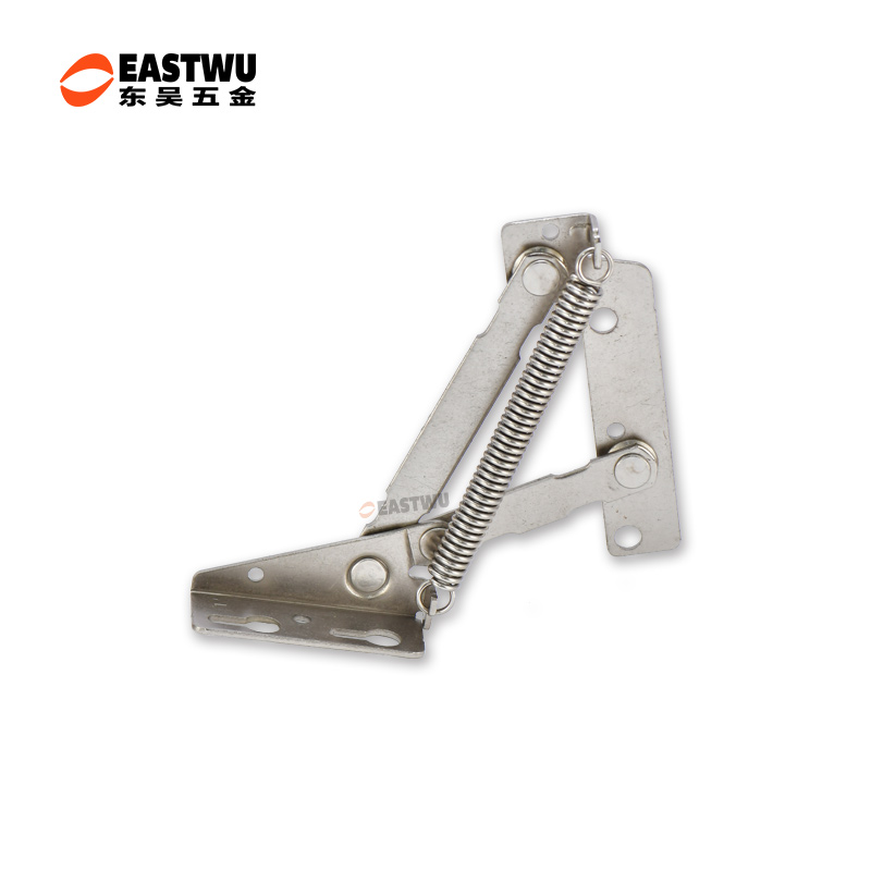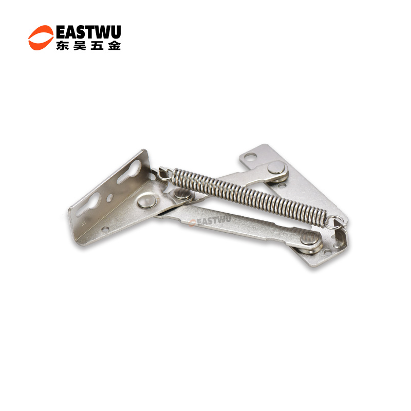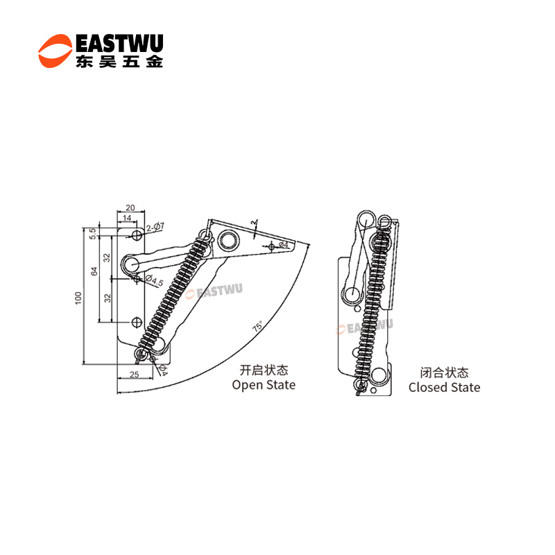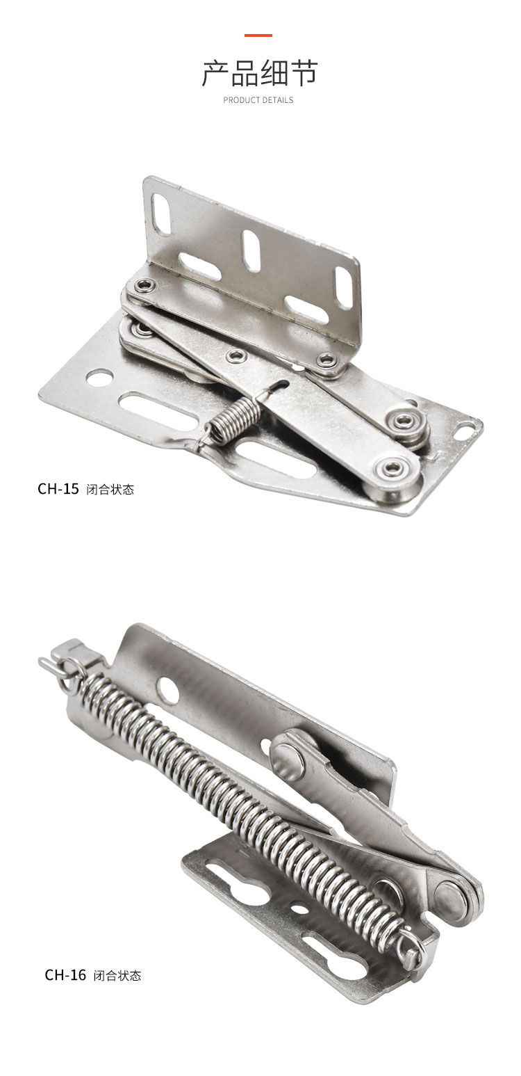 冷軋鋼房車吊柜鉸鏈 免開孔 無(wú)需加裝氣撐 柜門自動(dòng)撐起 適用門厚15-18mm 開啟角度75° 使用范圍房車吊柜、衣柜等