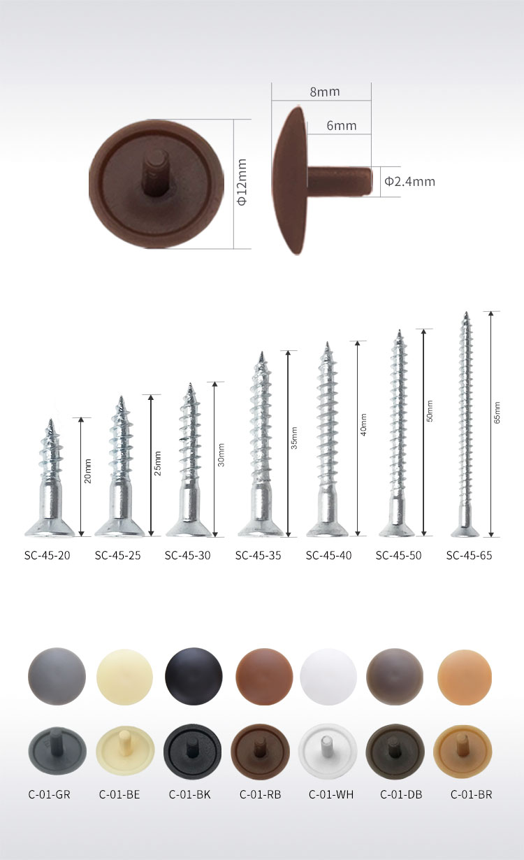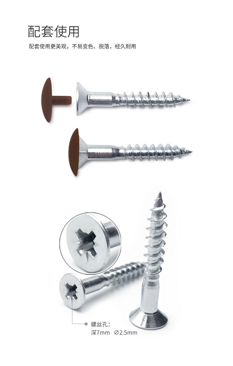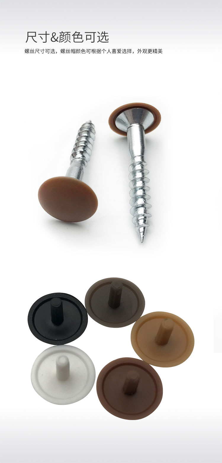 鋼螺絲 帶裝飾帽 遮丑帽 7種尺寸可供選擇; 4.5X20mm 4.5X25mm 4.5X30mm 4.5X35mm 4.5X40mm 4.5X50mm4.5X65mm 螺絲頭部Φ2.5mm深7mm 螺絲可配裝飾帽,多種顏色可以選擇 也可根據(jù)家具板顏色定制