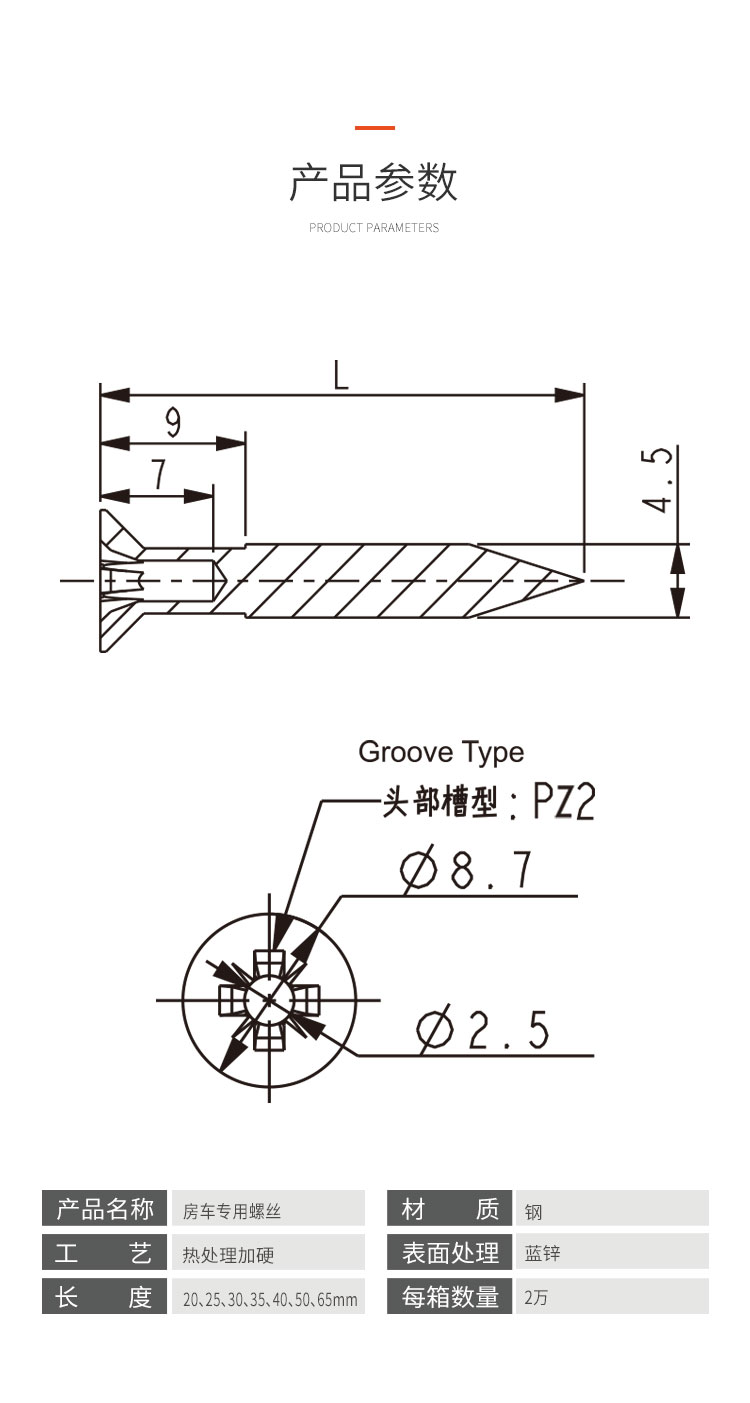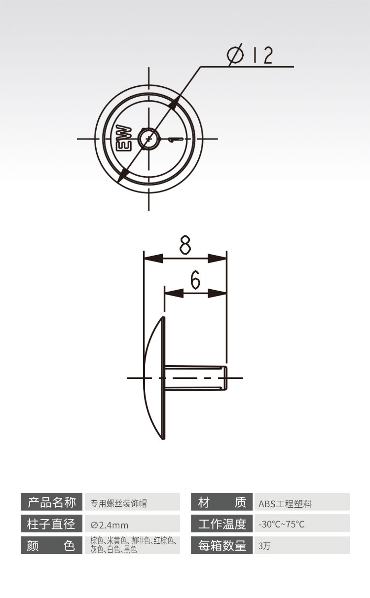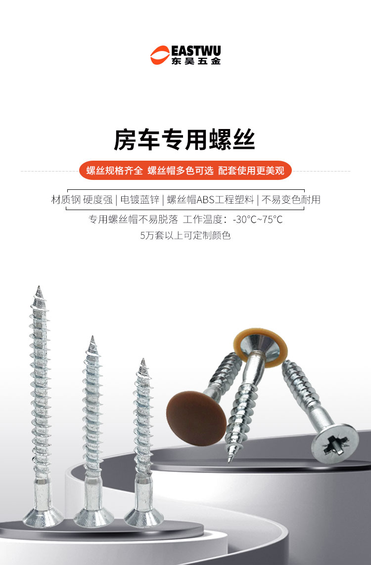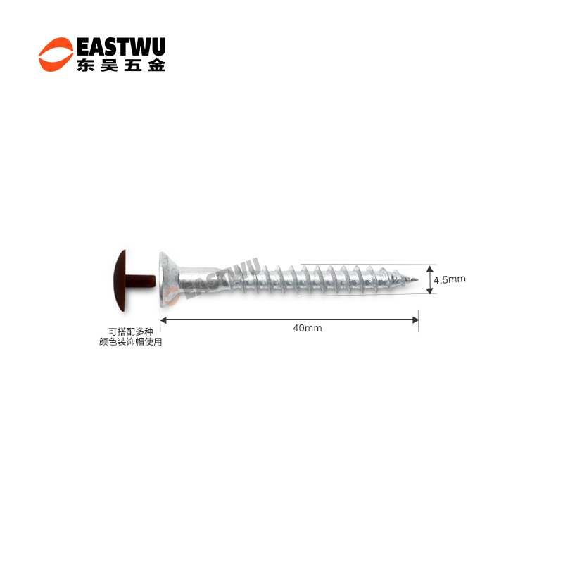鋼螺絲 帶裝飾帽 遮丑帽 7種尺寸可供選擇; 4.5X20mm 4.5X25mm 4.5X30mm 4.5X35mm 4.5X40mm 4.5X50mm4.5X65mm 螺絲頭部Φ2.5mm深7mm 螺絲可配裝飾帽,多種顏色可以選擇 也可根據(jù)家具板顏色定制