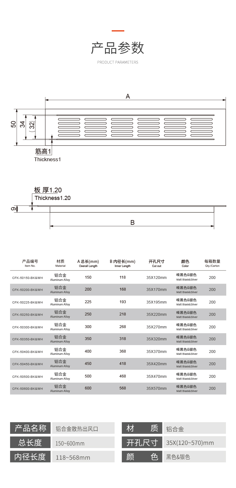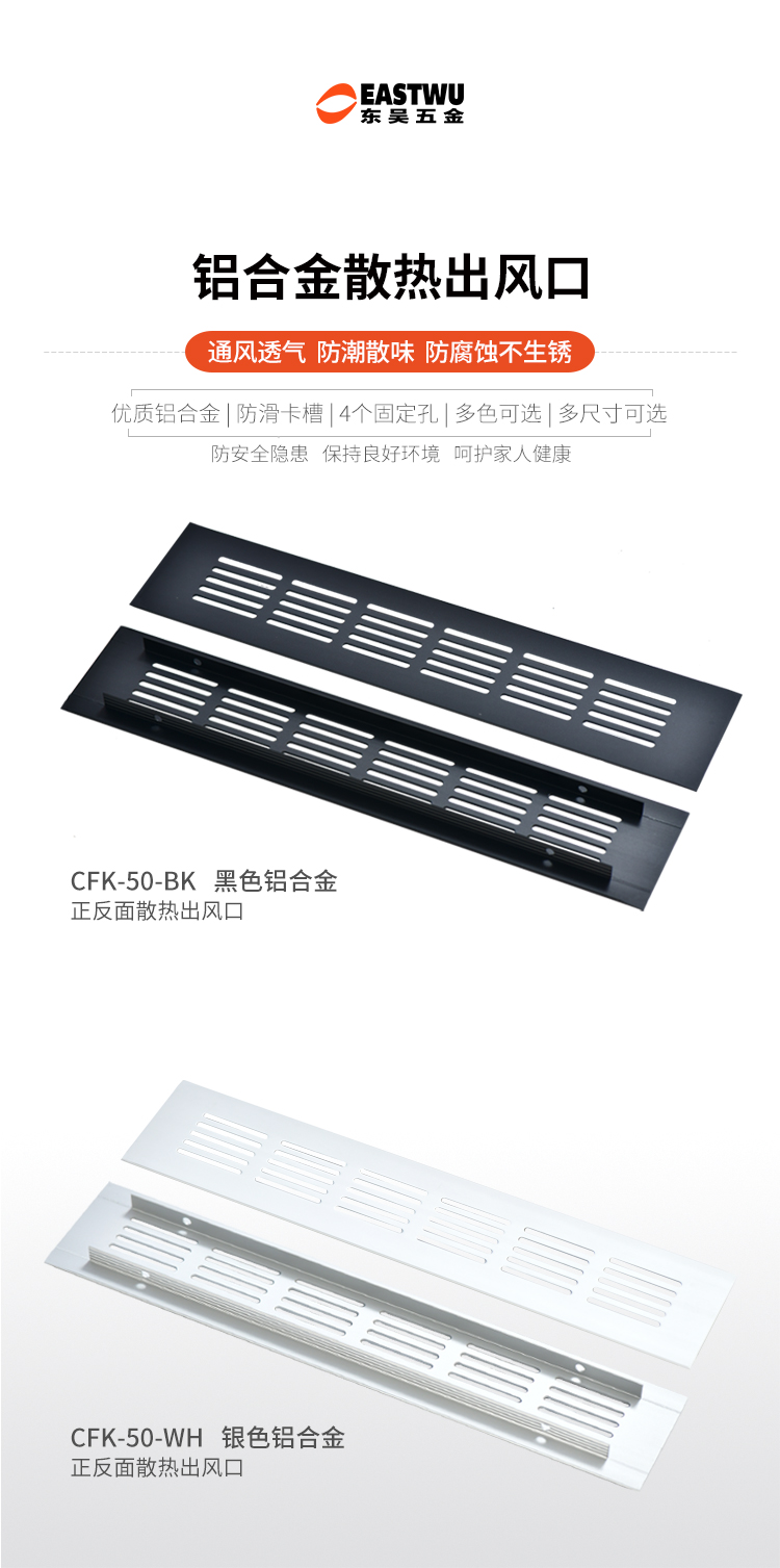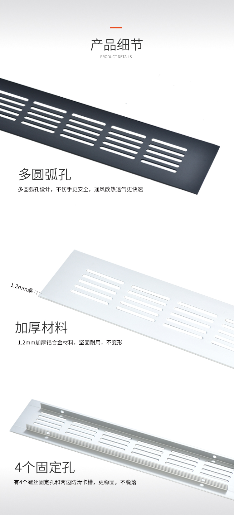 鋁合金散熱出風(fēng)口,加強(qiáng)空氣流通,散熱出風(fēng)快,長(zhǎng)度和顏色均可定制 寬50MM1.2MM厚