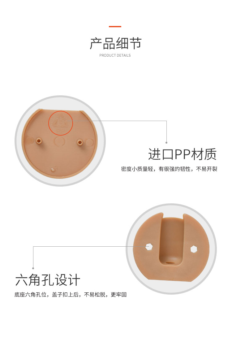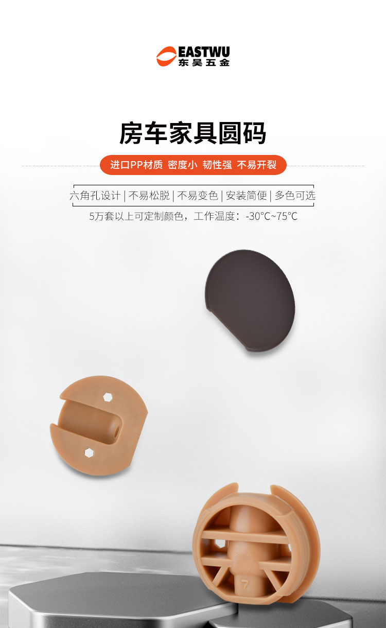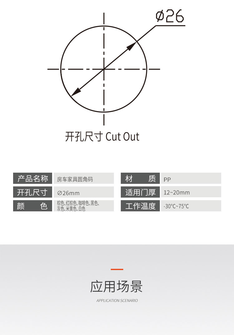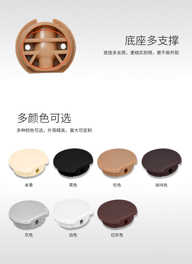 ·多色可選 可定制顏色 六邊形設(shè)計 不易脫落 不開裂 ·門板厚度:12~20mm 開孔尺寸:Φ26mm 工作溫度:-30C~75℃ 材質(zhì):PP 量大可定制顏色