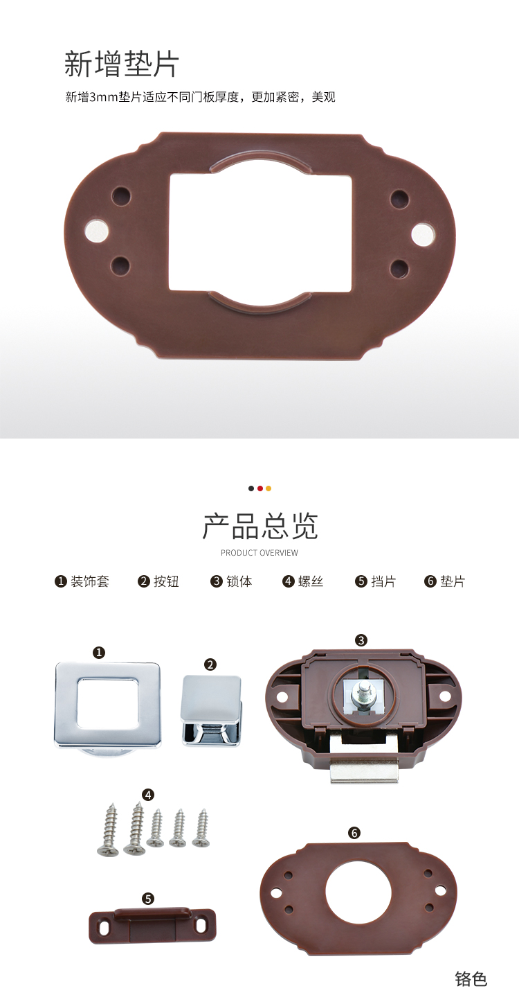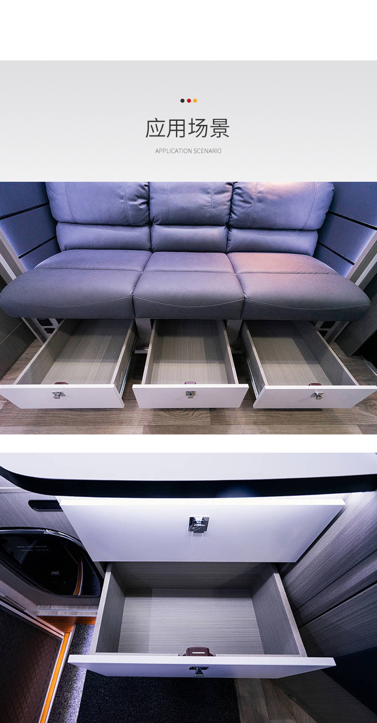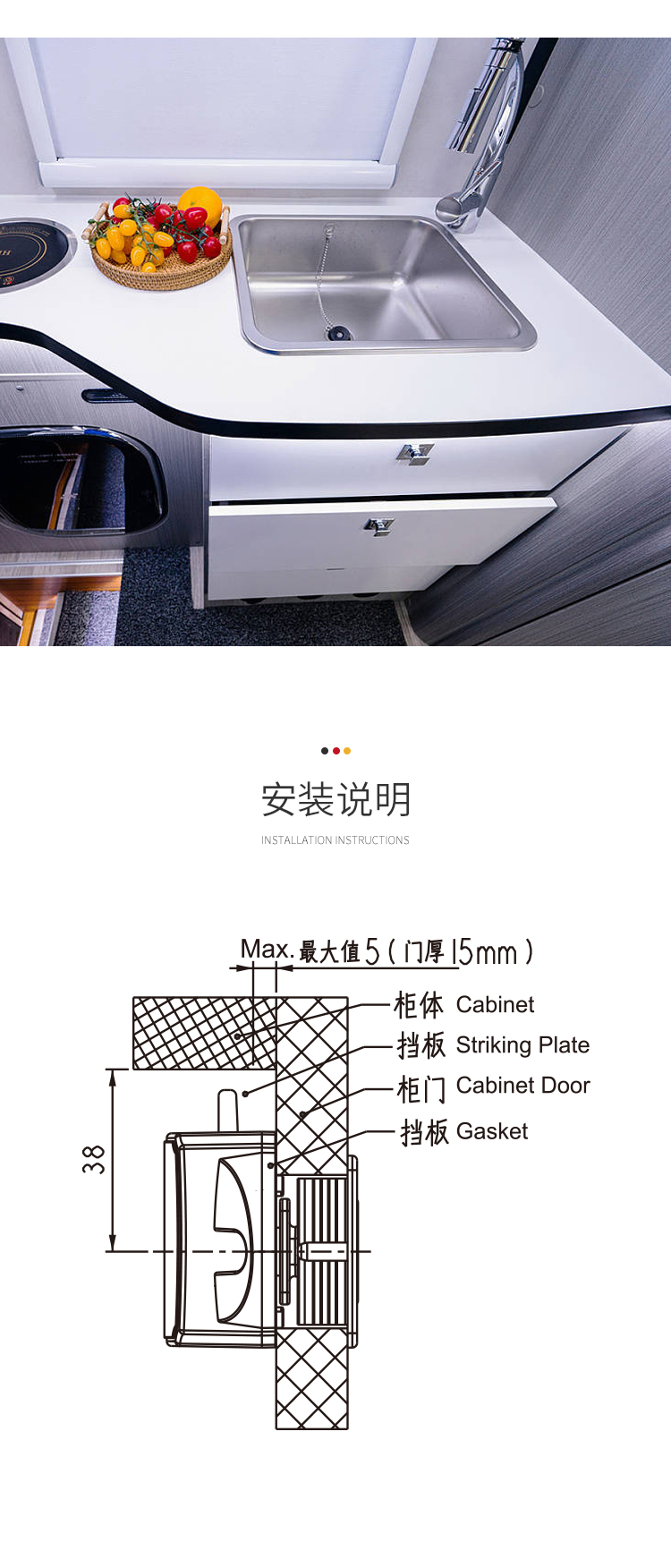 ·適用于房車、旅居車、救護車、改裝車、吊柜、櫥柜、抽屜可避免在行駛過程中家具門打開 ·材質:鋅合金&塑料 門板厚度:12~18mm 開孔尺寸:Φ32mm