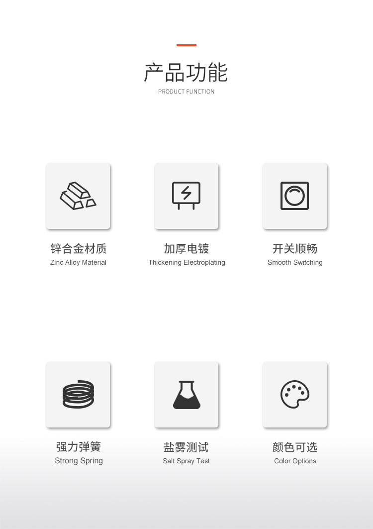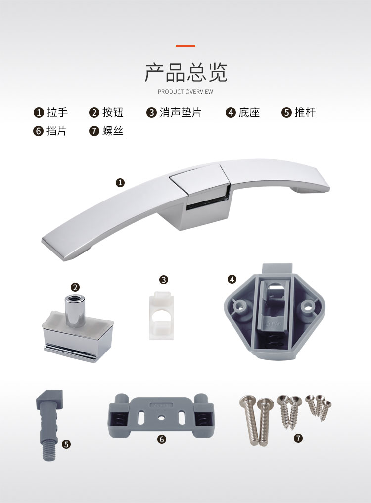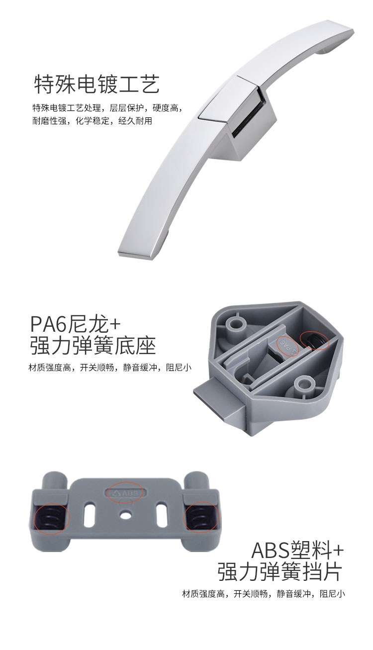 鋅合金按鈕與拉手,尼龍鎖殼,消聲墊片 靜音降噪 優(yōu)質(zhì)原材料 按壓順暢、穩(wěn)定,外觀精美 顏色可選