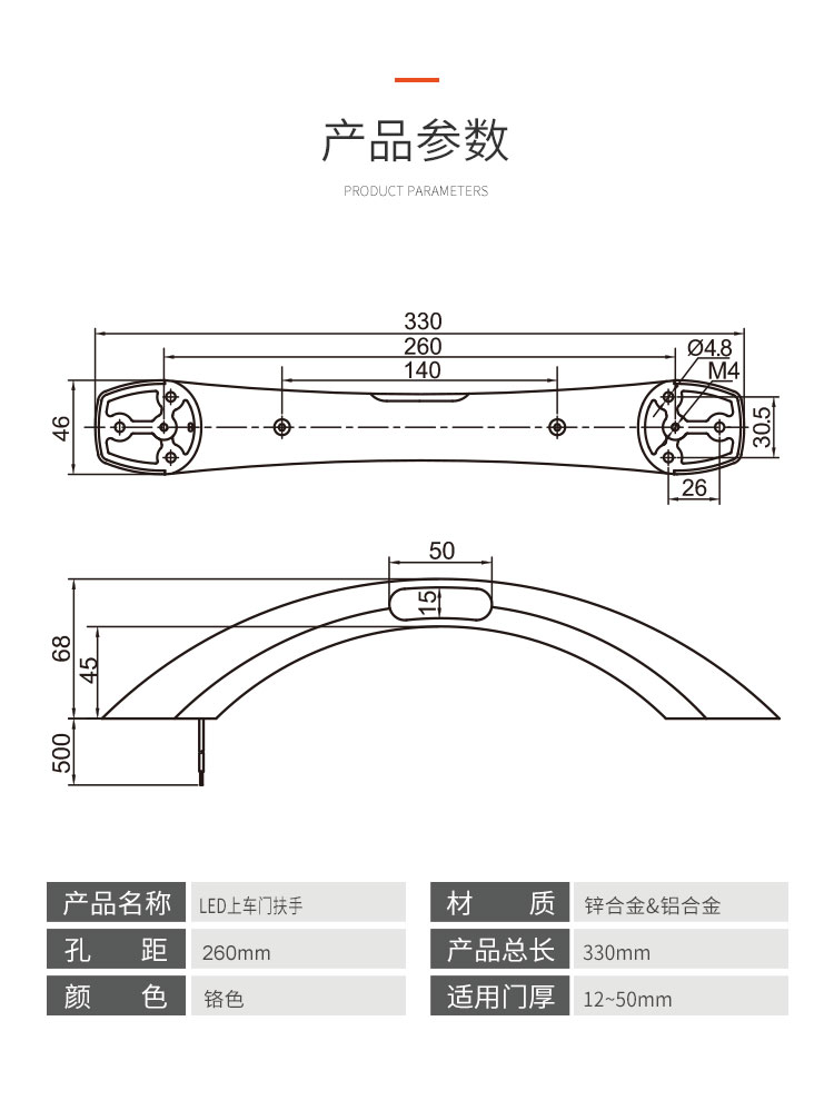 鋅合金&鋁合金LED上車門扶手 功率1W 電壓12V 工作溫度20-45℃ 防水等級IP20 上下分體式結(jié)構(gòu),可以從家具正面或背面安裝