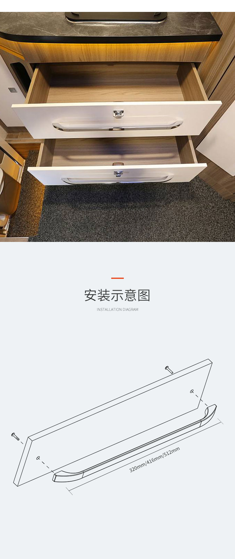 ·適用于房車、旅居車、救護車、改裝車、櫥柜、抽屜簡約百搭 ·材質(zhì):鋅合金&鋁合金 門板厚度:12-30mm 孔距:512/416/320mm