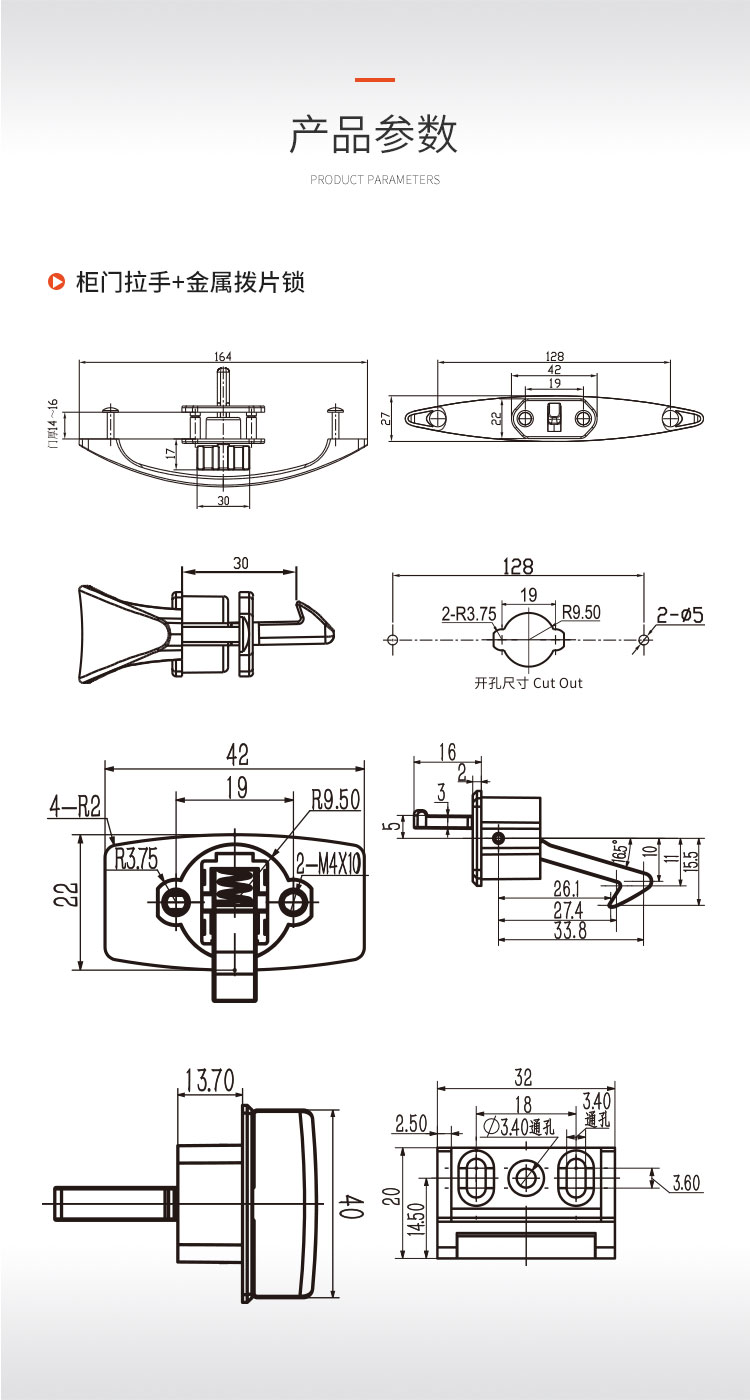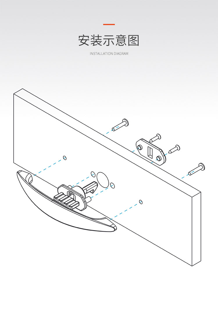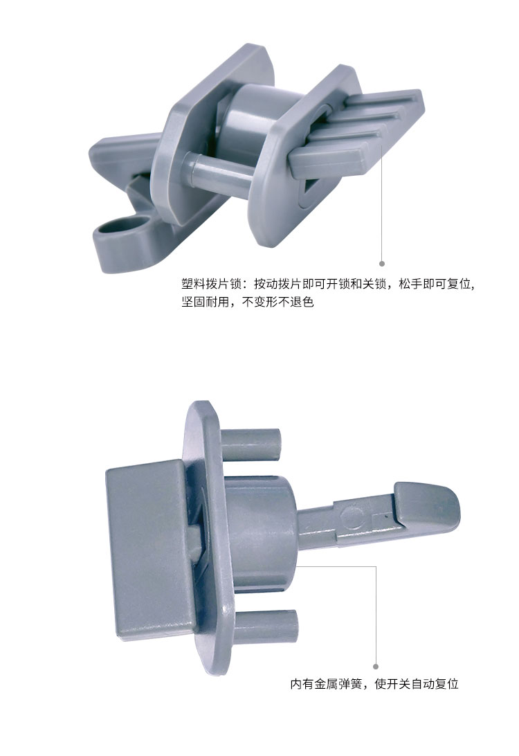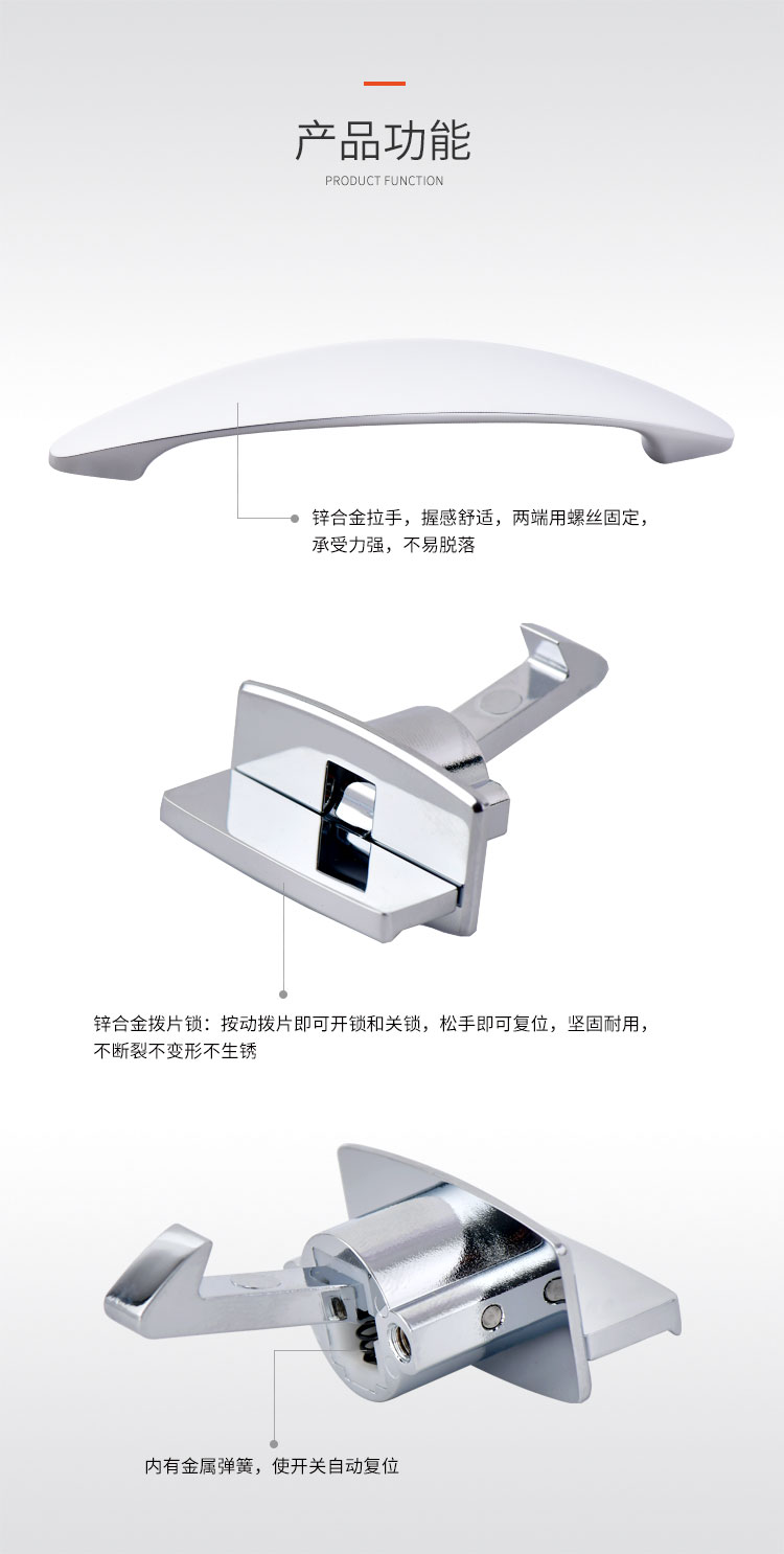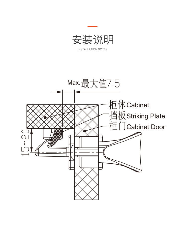 ·達(dá)中性鹽霧(NSS)測(cè)試200小時(shí)10級(jí)要求以上的檢驗(yàn),高于行業(yè)4倍以上耐腐標(biāo)準(zhǔn) ·材質(zhì):鋅合金&尼龍 門板厚度:14~16mm 開孔尺寸:Φ:20mm