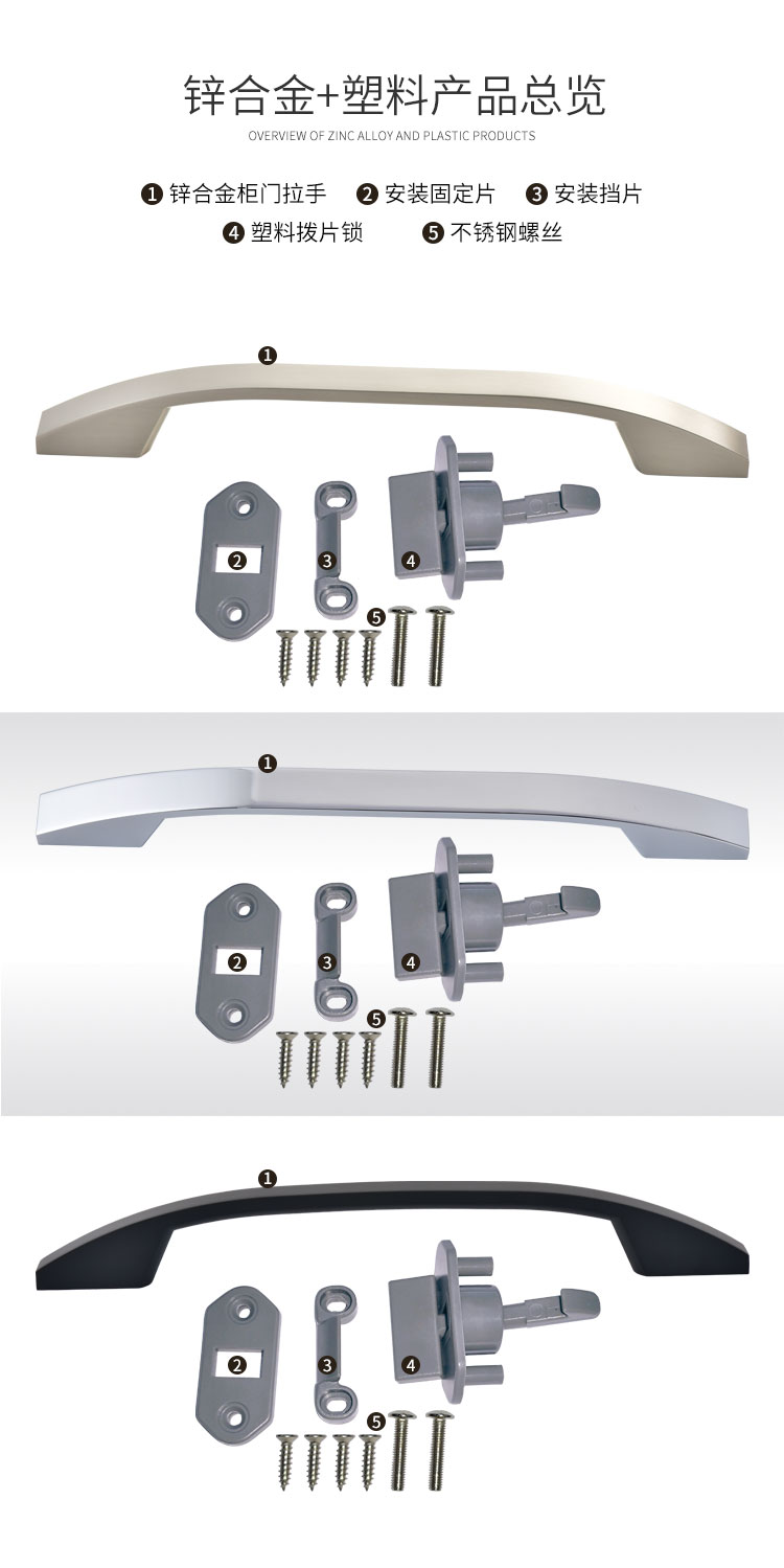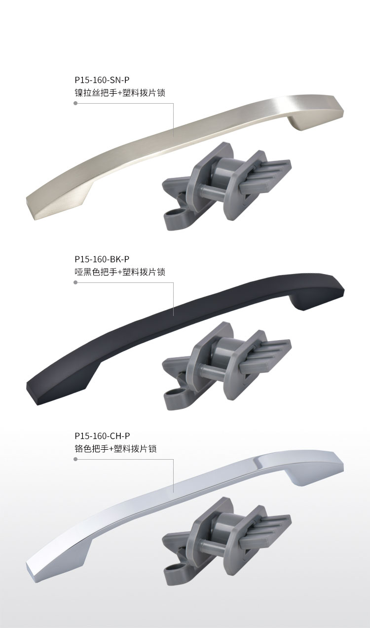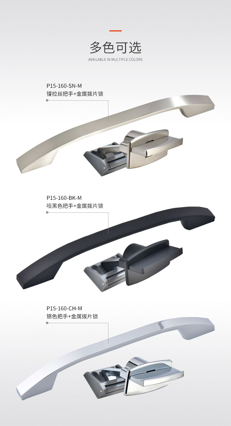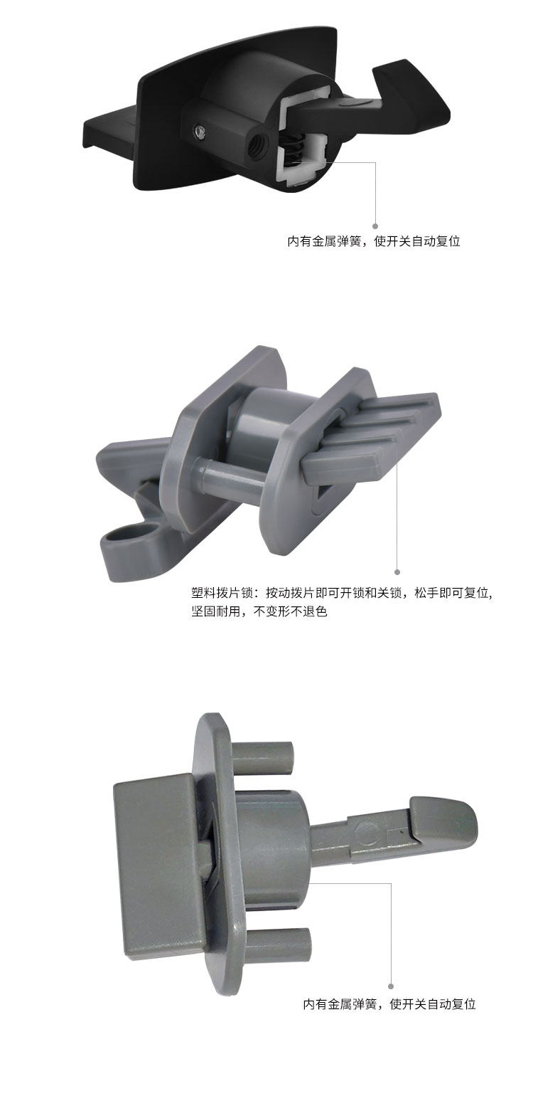 柜門拉手可配塑料搭扣鎖或金屬搭扣鎖,拉手和金屬搭扣鎖顏色可選,開孔尺寸?19mm 開關(guān)輕盈,手感舒適,外觀漂亮