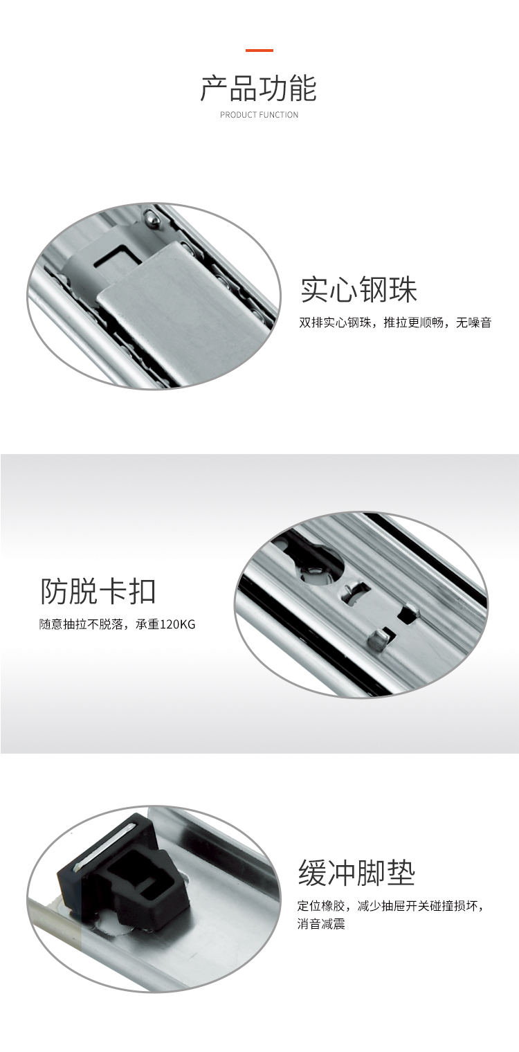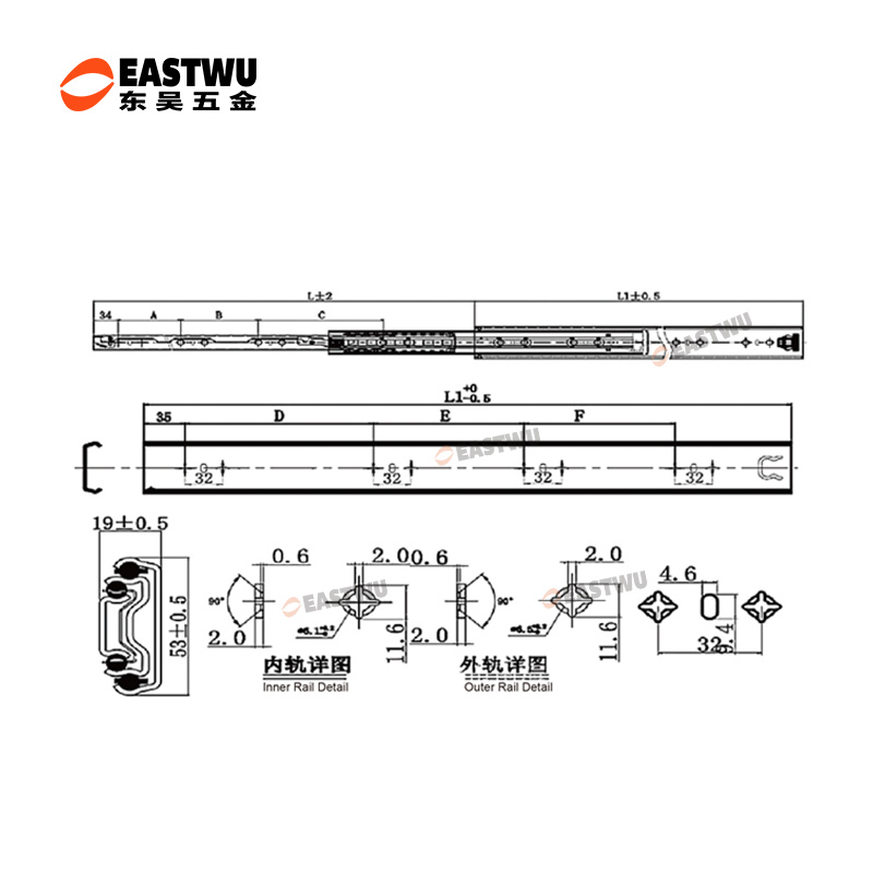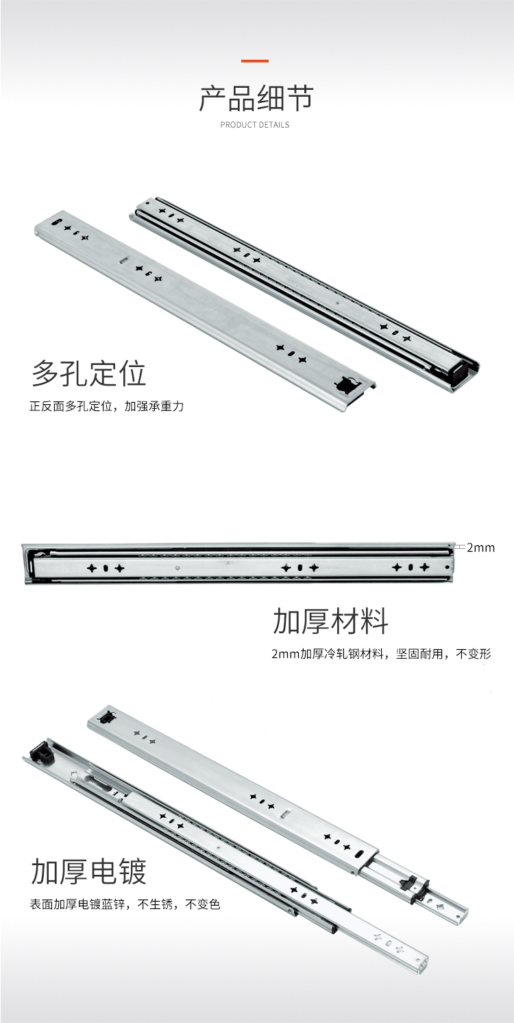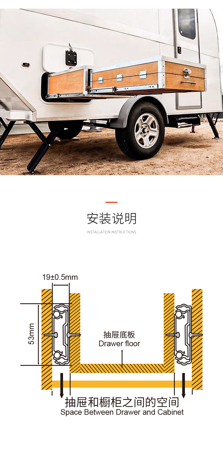 ·適用房車櫥柜、工業(yè)抽屜 安裝在抽屜側(cè)面 承重:120KG 長度:250-1800mm 導(dǎo)軌寬度:53mm 導(dǎo)軌厚度:19mm 材料厚度:2.0mm 使用范圍:房車櫥柜、工業(yè)抽屜等