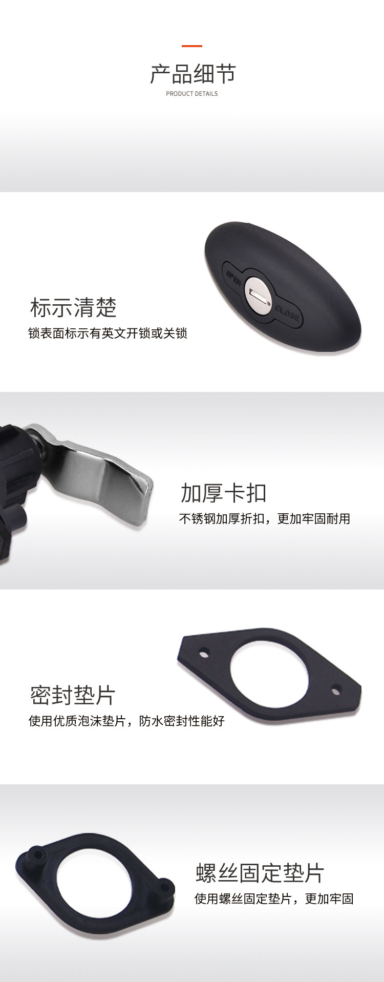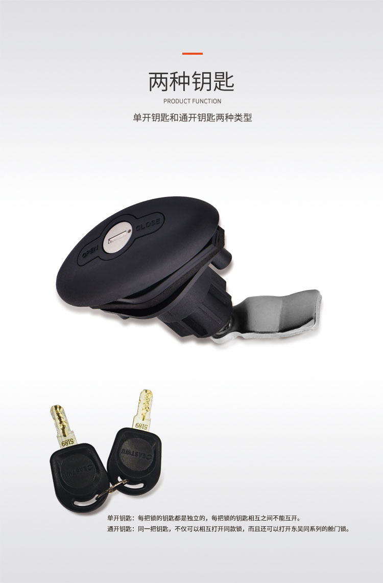 特點(diǎn):可定制與房車門鎖一樣的鑰匙,一把鑰匙就可以開房車上面的所有艙門鎖與門鎖。開孔尺寸φ32mm 鋅合金&尼龍材質(zhì) 適用門厚20-35mm